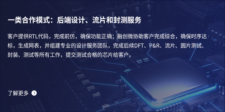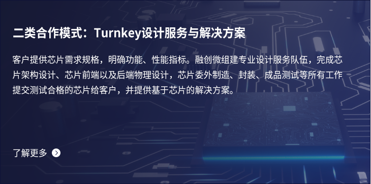 融创微致力于为客户提供从芯片定义到设计流片的全流程服务,包括:芯片架构定义、IP选型、前端设计、DFT、验证、物理设计、版图、流片、封装和测试服务等。 同时,融创微还可以帮助客户委外完成晶圆制造、封装和测试等,提供Turn-key一站式服务。